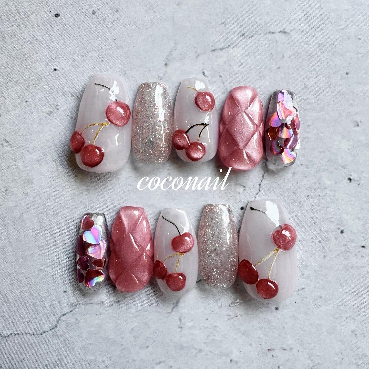 #さくらんぼネイル#マグネットネイル#ピンク#うるうるネイル#ブライダルネイル#結婚式ネイル#ガーリーネイル#キルティングネイル#ぷっくりネイル#地雷系#量産型#成人式ネイル