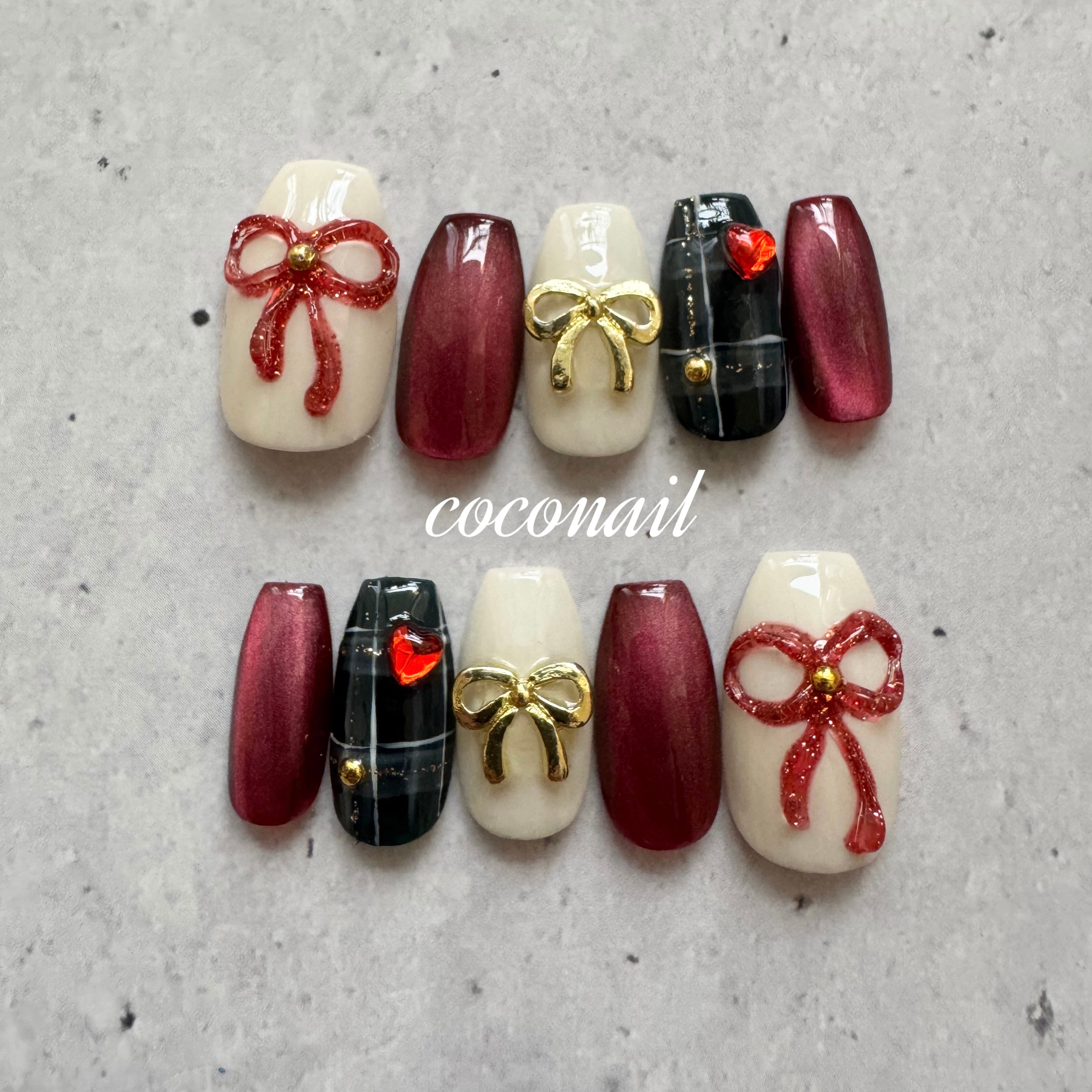 #ボルドーネイル#ワンホンネイル#うるうるネイル#結婚式ネイル#リボンネイル#ハートネイル#ニュアンスネイル#ガーリーネイル#成人式ネイル#クリスマスネイル