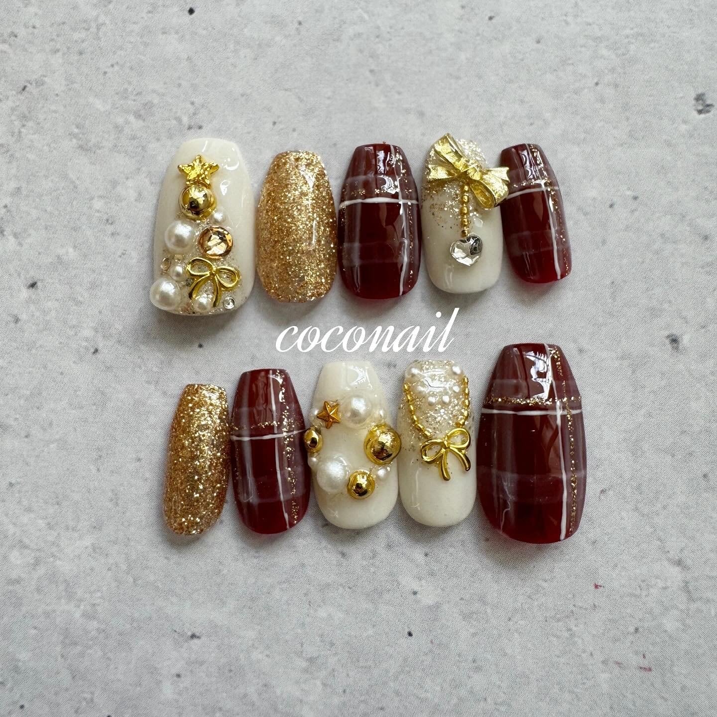 sizeorder ネイルチップ ボルドー クリスマス うるうる リボンネイル